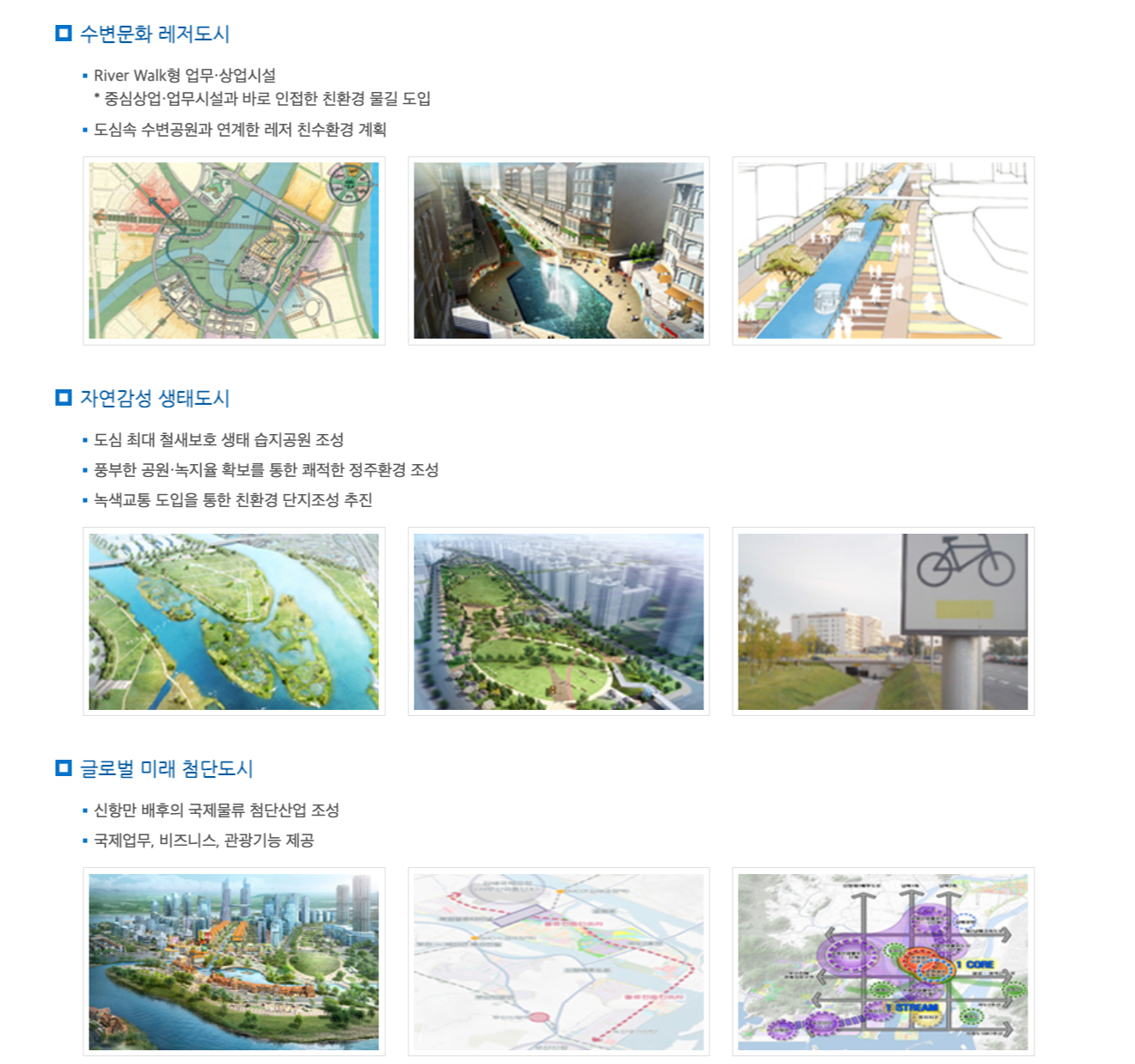 - 수변 중심의 고품격 친수 주거환경과 주거ㆍ상업ㆍ업무ㆍ예술ㆍ문화가 어우러지는 복합수변공간 조성으로 하천 중심의 다양한 미래 여가ㆍ문화공간 제공