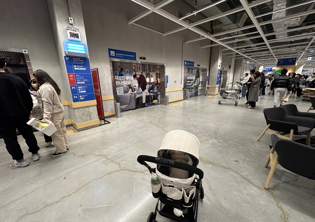 계단 좌측의 엘레베이터를 타면 2층에서 내릴 수 있다 그러면 쇼룸들을 보고 구경을하고 그 이후 개모차가 탑승가능한